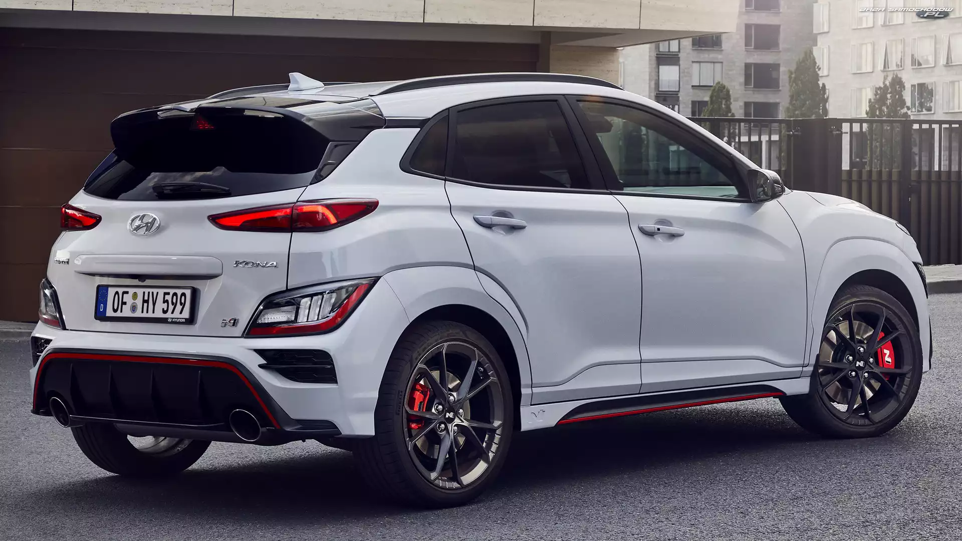 Biały, Hyundai Kona N, Tył, Bok- Zdjęcia samochodów