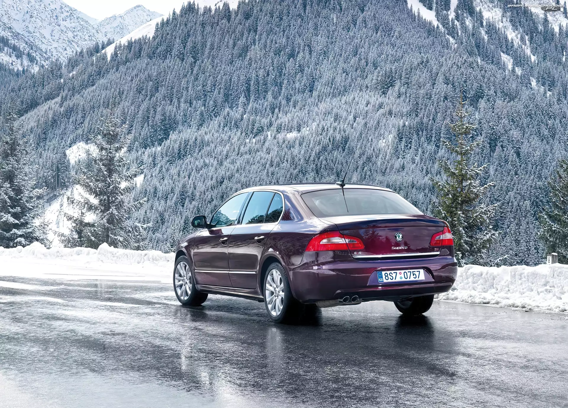 Skoda Superb, Lód, Bordowa, Zima- Zdjęcia samochodów